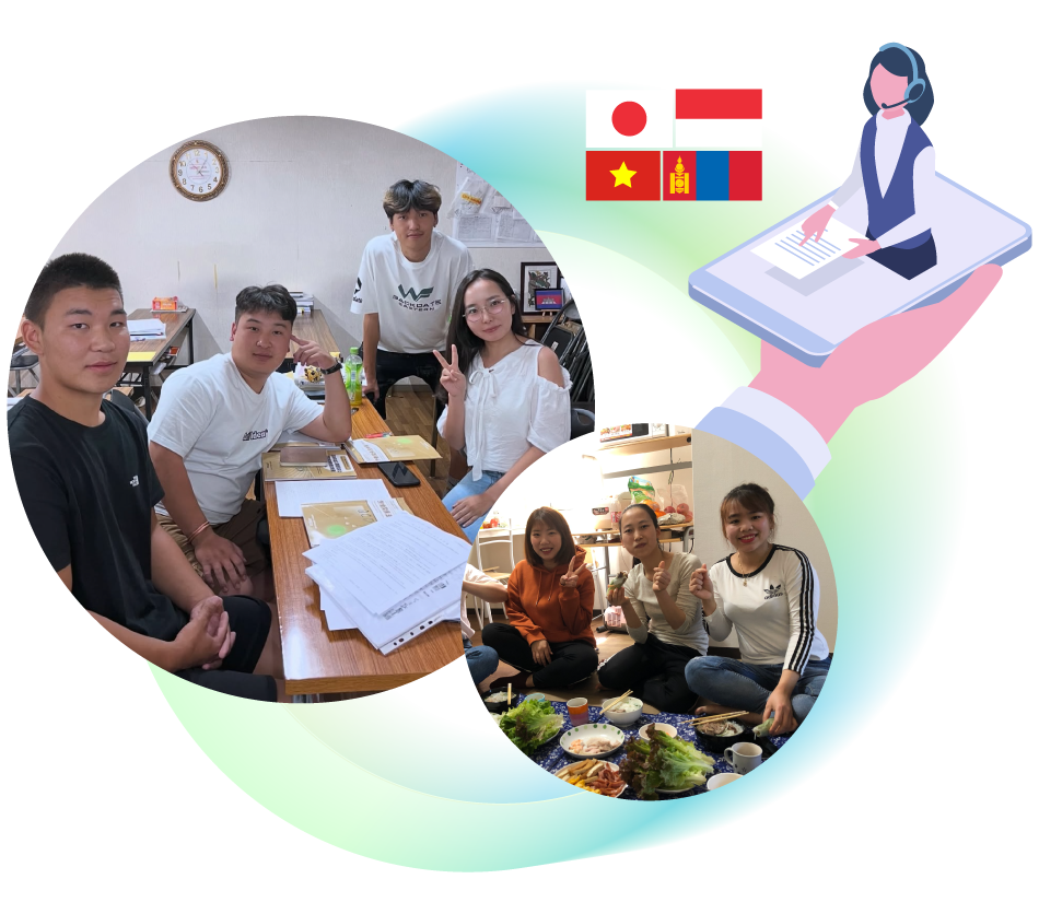 ワールドチアーズ協同組合には、受け入れ実習生の母国出身のインドネシア、ベトナム、モンゴル人のスタッフが常勤し、日々の実習生の状況を把握しています。